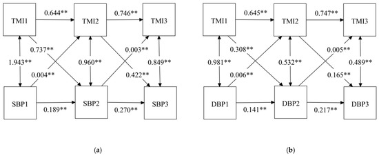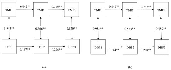 Cross-lagged model with TMI and BP among children at three time points: (a) cross-lagged model with TMI and SBP; (b) cross-lagged model with TMI and DBP; ** p < 0.001; TMI, tri-ponderal mass index; SBP, systolic blood pressure; DBP, diastolic blood pressure.