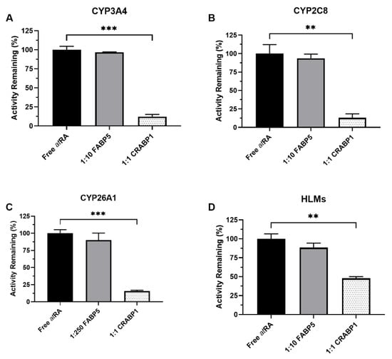 Effect of FABP5 and CRABP1 on the metabolism of atRA. The 4-OH-atRA formation was measured in incubations with recombinant CYPs and HLMs in the presence and absence of binding proteins. The incubations were conducted, as described in Materials and Methods, with all reactions initiated by adding the substrate pre-complexed with the binding protein. The impact of FABP5 (10 or 250-fold excess to atRA) and CRABP1 (equal concentrations as atRA) on 4-OH-atRA formation by (A) CYP3A4, (B) CYP2C8, (C) CYP26A1 and (D) human liver microsomes (HLMs) is shown. atRA concentration was 1 µM in (A,B), 20 nM in (C) and 500 nM in (D). ** p-value < 0.01, *** p-value < 0.001, one-way ANOVA with Dunnett’s post hoc test.