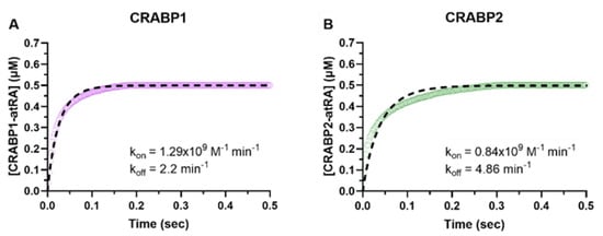 CRABP–atRA-binding kinetics determined with stopped-flow. Association of atRA (2 μM) with CRABP1 (A) and CRABP2 (B) (0.5 μM) was monitored from the increase in atRA fluorescence due to CRABP binding, as described in Materials and Methods. The concentration of holo-CRABP was calculated based on the fluorescence yield of holo-CRABP. The shaded line in panels (A,B) show the observed time course of change in holo-CRABP1 (A) and holo-CRABP2 (B) concentrations following mixing of CRABPs with atRA. The dashed line shows the model fits to the data. The fitted association (kon) and dissociation (koff) constants for the specific experiment are shown in insets.
