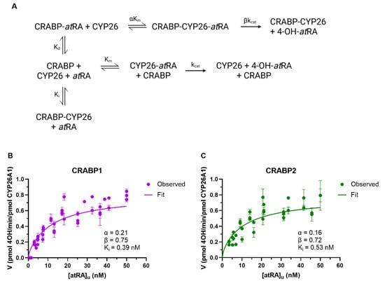 The CRABP-CYP26 interaction model and fit of the interaction model to the 4-OH-atRA formation data. The kinetic scheme for the model of the 4-OH-atRA formation by CYP26s in the presence of CRABPs that incorporates holo-CRABP and apo-CRABP-CYP26 interactions is shown in (A) (created with BioRender.com accessed on 8 April 2022). αKm is the affinity of holo-CRABP for CYP26, Ki is the affinity of apo-CRABP for CYP26 and βkcat is the rate of catalysis for an atRA-CRABP-CYP26 ternary complex. The model was globally fit to the data with CYP26A1 as described in Materials and Methods, and plots with observed 4-OH-atRA formation data (circles) and model fits (solid lines) for CYP26A1 in the presence of CRABP1 (A) and CRABP2 (B) are shown.