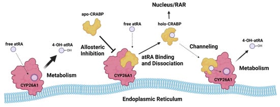 Kinetics informed model of CRABP cellular functions in regulating atRA metabolism and homeostasis. CYP26A1 metabolizes atRA to 4-OH-atRA to facilitate atRA clearance from the cell. Apo-CRABP is bound to CYP26A1 in the ER to prevent atRA metabolism when atRA levels are scarce and an excess of apo-CRABP is present. When atRA is abundant, more CRABP is bound to atRA, releasing holo-CRABP from CYP26A1 and increasing holo-CRABP levels in the cell. Holo-CRABP may facilitate the delivery of atRA to nuclear receptors or directly channel atRA to CYP26A1 for metabolism (figure created with BioRender.com accessed on 8 April 2022).