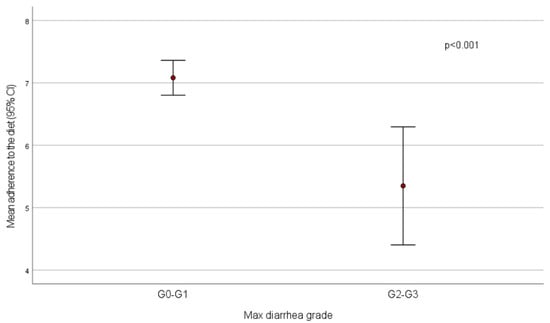 Mean adherence to the diet was significantly lower in patients who experienced diarrhea with maximum grade 2–3 compared to those who had no diarrhea or grade 1 diarrhea (score = 5.4 ± 1.9 vs. 7.1 ± 1.5, p < 0.001) (Figure 1). All patients who had high adherence had no diarrhea (n = 20) or grade 1 (n = 16) diarrhea, while low adherence was recorded in 3/77 (3.8%) patients without diarrhea and in 4/18 (22.2%) subjects with diarrhea reaching a maximum grade 2–3 (p < 0.001).