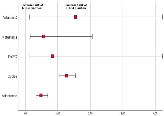 Logistic regression analysis, including dependent variables low vs. high–medium adherence to diet, DYPD mutation, presence vs. absence of metastases, Vitamin D low vs. high blood level, and the number of completed chemotherapy cycles, was performed. Patients with higher adherence to the diet were found to have a lower risk of grade 2 or 3 diarrhea (odds ratio: 0.5 (95% CI: 0.3–0.7, p < 0.001)). In addition, patients who completed a higher number of chemotherapy cycles had an increased risk of grade 2 or 3 diarrhea (odds ratio: 1.2 (95% CI: 1.0–1.5, p = 0.02)) (Figure 2).