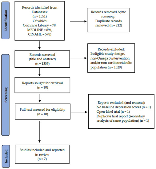 - Appleton, K.M.; Sallis, H.M.; Perry, R.; Ness, A.R.; Churchill, R. ω-3 Fatty acids for major depressive disorder in adults: An abridged Cochrane review. BMJ Open 2016, 6, e010172. [Google Scholar] [CrossRef] [PubMed] [Green Version]