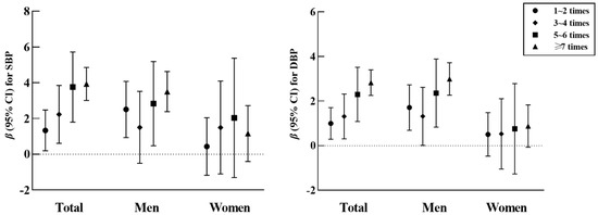 Figure 1 and Supplementary Materials Tables S1 and S2 portray the relationship between the frequency of EAFH and blood pressure (SBP and DBP). Figure 1 was made according to Tables S1 and S2. It could be found that, in the three models, there were positive associations of EAFH frequency with SBP and DBP (P trend < 0.001) in the total population and men but not in women. In model 3, compared with the reference group, when the frequency of EAFH was ≥7 times, the total population, men, and women had the highest β-coefficients (95% CI) of DBP, which were 2.825 (2.252–3.398), 2.990 (2.262–3.718), and 0.880 (−0.067–1.827), respectively; for SBP, these were 3.931 (3.008–4.853) and 3.504 (2.380–4.627) in the total population and men, respectively, when the frequency of EAFH was ≥7 times and 2.035 (−1.303–5.374) for women when the frequency was 5–6 times. In addition, 1-SD increases in the frequency of EAFH were significantly associated with SBP increasing by 24.1% and 18.7%, and DBP increasing by 17.4% and 16.6%, in the total population and men, respectively.