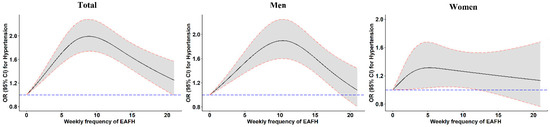 In the overall population, taking the participants with 0 times EAFH per week as the control group, those who ate away from home for breakfast, lunch, and dinner had an increased risk of hypertension, except when the frequency of EAFH for breakfast was 3–4 times per week (p > 0.05) (Figure 3). Figure 3 was made according to Supplementary Materials Tables S3–S5. After gender stratification, men who ate out at lunch had elevated odds of hypertension, and those who for whom the frequency of EAFH per week for breakfast was 5–6 times (OR 1.565, 95% CI 1.013–2.418) and for dinner was 3–4 times (OR 1.713, 95% CI 1.328–2.208) had the highest likelihood of hypertension. Furthermore, for the general population and for men, each SD increment in the frequency of EAFH for breakfast increased the OR of hypertension by 5.5% (95% CI 2.9–8.1%) and 4.3% (95% CI 1.3–7.5%); each increment for lunch increased the OR by 7.5% (95% CI 5.4–9.6%) and 7.4% (95% CI 4.9–9.9%); and each increment for dinner increased the OR by 6.6% (95% CI 4.0–9.3%) and 4.4% (95% CI 1.3–7.5%), respectively (Supplementary Materials Tables S3–S5).