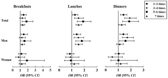 Associations between frequency of EAFH breakfasts, lunches, and dinners and hypertension among participants. OR, odds ratio; CI, confidence interval; EAFH, eating away from home. Adjusted for age, gender (only for total participants), marital status, education level, average income per month, smoking status, alcohol consumption, physical activity, abundant vegetable and fruit intake, high-fat diet, and family history of hypertension.