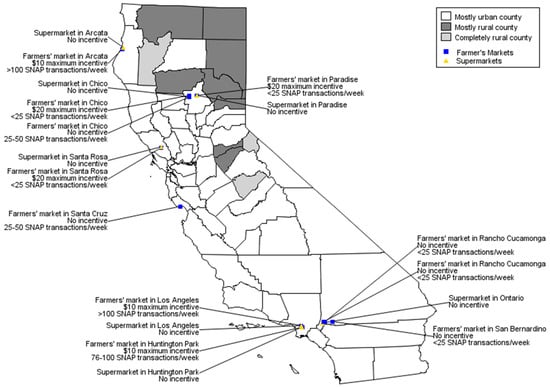 This study included a convenience sample of farmers’ markets and nearby supermarkets (study sites) throughout California that were invited to participate in an evaluation of CNIP. Farmers’ markets were first stratified by the financial incentive offered through CNIP (no incentive offered, USD 10 maximum offered, or USD 20 maximum offered) and then selected, with higher priority given to farmers’ markets with greater numbers weekly SNAP transactions, and located in a census tract with primarily English- or Spanish-speaking adults below the federal poverty line. Staff at a nonprofit organization disbursing CNIP funds to participating farmers’ markets introduced members of the research team to managers at markets identified for inclusion in the sample. The research team contacted the market managers to describe the study and request permission to collect data. All farmers’ market managers agreed to participate in the research. A local supermarket within five miles of each participating farmers’ market was invited to participate.