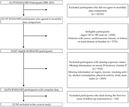 Among the 61,379 KNHANES participants, 43,157 (70.3%) agreed to mortality follow-up. Participants who did not agree to this were excluded from this study, but the results are not biased as a result because the excluded participants had similar demographic characteristics to those who were included. Participants aged <30 years or >80 years (n = 6595), those who were diagnosed with liver or kidney disease, cancer, or CVD at baseline (n = 3735), or whose serum 25-hydroxy vitamin D (25(OH)D) (n = 7032) and covariates (n = 2919) information was lacking, were also excluded. Finally, to reduce the possibility of reverse causation by subclinical diseases, we excluded subjects that died during the first 2 years of follow-up assessment (n = 134). Ultimately, 22,742 individuals (9325 men and 13,417 women) were included in this study (Figure 1).