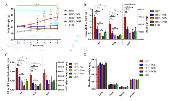 PO prevents HFD-induced obesity in mice. (A) Body weight. * comparison between HFD and LFD, $ comparison between HFD and HFD + POL, # comparison between HFD and HFD + POM, & comparison between HFD and HFD + POH, % comparison between HFD + POL and HFD + POM or HFD + POH. (B) Mass of adipose tissue. (C) Ratio of adipose tissue to body weight. (D) Ratio of organs to body weight. Data are shown as mean ± SEM (n = 8). *, $, #, &, % p < 0.05; **, $$, ##, && p < 0.01.
