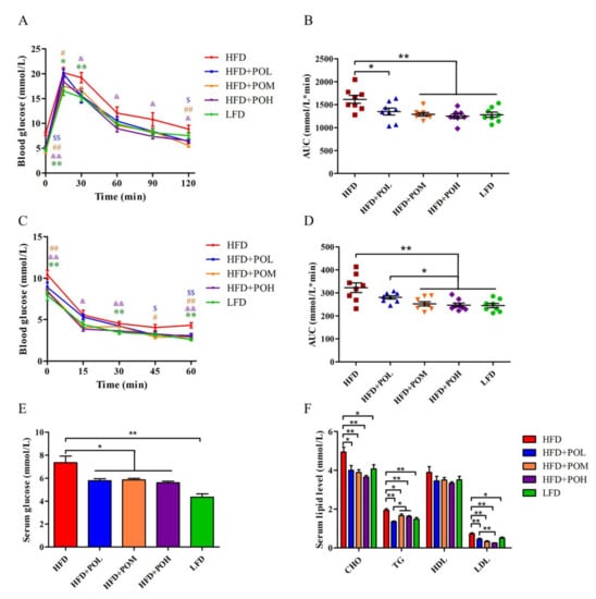 PO maintains glucose homeostasis and reduces blood lipid level. (A) GTT. (B) Area under curve of GTT. (C) ITT. (D) Area under curve of ITT. (E) Fasting blood glucose. (F) Blood lipid. (A,C) * comparison between HFD and LFD, $ comparison between HFD and HFD + POL, # comparison between HFD and HFD + POM, & comparison between HFD and HFD + POH. Data are shown as mean ± SEM (n = 8). *, $, #, & p < 0.05; **, $$, ##, && p < 0.01.