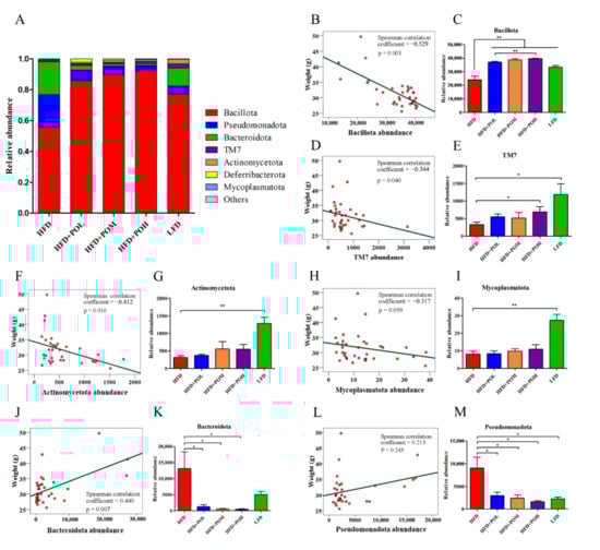 PO beneficially modulates the composition of gut microbiota. (A) Microbiota profile at phylum level; (B–M) Correlation analysis between the relative abundance of gut microbiota at phylum level and body weight. Data are shown as mean ± SEM (n = 6–8). * p < 0.05, ** p < 0.01.