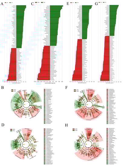 LEfSe analysis. (A,B) Biomarker taxa and cladogram between HFD and LFD; (C,D) Biomarker taxa and cladogram between HFD and HFD + POL; (E,F) Biomarker taxa and cladogram between HFD and HFD + POM; (G,H) Biomarker taxa and cladogram between HFD and HFD + POH. n = 6–8.