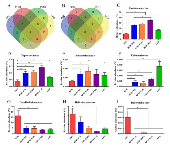 Gut bacteria at the family level showed significant differences between HFD group and other groups. (A) Venn diagram of increased families in PO treatment groups and LFD compared with HFD; (B) Venn diagram of decreased families in PO treatment groups and LFD compared with HFD; (C–F) The relative abundance of families increased by all of the three PO treatments and LFD; (G–I) The relative abundance of families decreased by all of the three PO treatments and LFD. Data are shown as mean ± SEM (n = 6–8). * p < 0.05, ** p < 0.01.