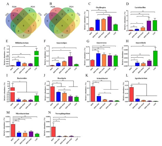Gut bacteria at the genus level showed significant differences between HFD group and other groups. (A) Venn diagram of increased genera in PO treatment groups and LFD compared with HFD; (B) Venn diagram of decreased genera in PO treatment groups and LFD compared with HFD; (C–H) The relative abundance of genera increased by all of the three PO treatments and LFD; (I–N) The relative abundance of genera decreased by all of the three PO treatments and LFD. Data are shown as mean ± SEM (n = 6–8). * p < 0.05, ** p < 0.01.