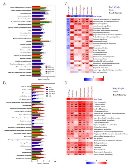 Prediction of gut microbiota function. (A) KEGG pathways increased by PO; (B) KEGG pathways decreased by PO; (C) Spearman’s correlation among body weight, main increased bacteria and increased KEGG pathways; (D) Spearman’s correlation among body weight, main decreased bacteria and decreased KEGG pathways. Data are shown as mean ± SEM (n = 6–8). * p < 0.05, ** p < 0.01.