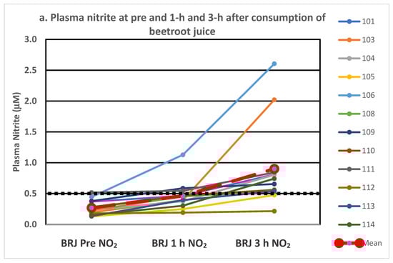 As shown in Figure 1a–c, 2 of the 12 participants (~17%) in each treatment were classified as non-responders based on our definition employed in this study as they did not achieve a plasma nitrite level of at least 0.50 μM at the 3 h time-point. This frequency is similar to our earlier work, which showed approximately 20% of participants had suboptimal responses [53,57]. Several factors are known to affect the nitrate–nitrite–nitric oxide metabolism, including composition and abundance of oral and gut microbes, use of hexedine-containing mouthwash, spitting, saliva flow rate, smoking, source of nitrate, dietary components (vitamin C, antioxidants, polyphenols and thiocyanates), digestion of the food bound nitrate to free inorganic nitrate, and stomach pH [58,59,60,61,62]. Efforts were made to minimize several of these factors through inclusion/exclusion criteria (non-tobacco users, no active gastrointestinal disorders, not taking medications suspected to alter gut pH), instructions to avoid use of mouthwash and maintaining a similar diet for the different treatments. Furthermore, the treatment order was randomized, and a washout period was employed in the research design.
