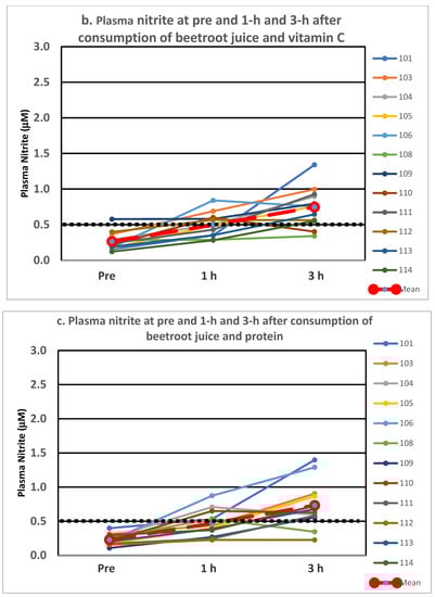Individual plasma nitrite levels at pre and at 1 h and 3 h post-consumption are depicted in Figure 1a–c for beetroot juice alone, with vitamin C and with protein, respectively. Two of the twelve participants within each treatment were deemed non-responders (3 h plasma nitrite level < 0.50 μM), with 10 classified as responders (3 h plasma nitrite level > 500 μM). Categorizing an individual as a responder or a non-responder was based on the definition employed in our study. Two separate participants failed to achieve the 0.50 μM level at 3 h for two of the treatments, and two others failed to achieve the 0.50 mM level on just one of the treatments. It is interesting to note the variability in the figures within and between individuals for the various treatments.