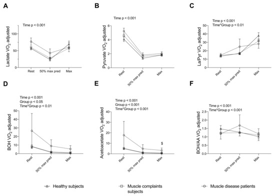 V’O2-adjusted biological parameters measured by routine automate in healthy subjects, muscle complaint subjects and muscle disease patients during CPET: (A) lactate; (B) pyruvate; (C) lactate/pyruvate ratio; (D) beta-hydroxybutyrate; (E) acetoacetate and (F) beta-hydroxybutyrate/acetoacetate ratio. Each patient was measured at three timepoints: rest, 50% of predicted maximal intensity and at maximal intensity. Data are presented as mean ± SEM at each time point. Significant p-value for post-hoc test $: healthy vs. muscle complaint subjects. AA: Acetoacetate; BOH: beta-hydroxybutyrate; CPET: Cardiopulmonary Exercise Test; La: lactate; Pyr: pyruvate; SEM: Standard Error of the Mean.