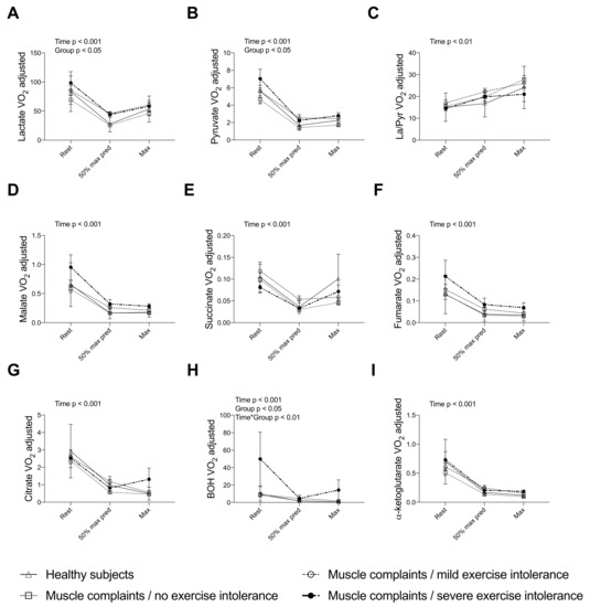 Simultaneous determination of energy, redox markers and TCA intermediates for healthy (n = 10) and some of muscle complaint subjects (n = 39) confirmed our results above using the enzymatic routine method, i.e., the blunted adaptations of the V’O2-adjusted La, Pyr, BOH, AA and their ratios. Yet, no significant difference in the time course of V’O2-adjusted TCA cycle intermediates was found between healthy and muscle complaint subjects, whatever the degree of exercise intolerance (Figure 3).