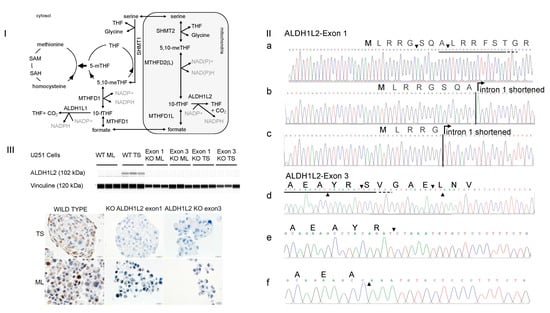 ALDH1L2 KO U251 glioblastoma cells were generated using the CRISPER-Cas9 system (I) One carbon metabolism features linked mitochondrial and cytosolic pathways; folate and méthionine cycles are intertwinned in the cytosol. THF: TetraHydroFolate, 5,10-meTHF: 5,10 methylene THF, 10-fTHF: 10-formylTHF, 5-mTHF: 5 methyl THF, SAM: S-adenosyl methionine, SAH: S-adenosyl homocysteine. (II) Genomic Sanger sequencing of individual deletion clones shows bi-allelic disruption of targeted exons 1 and 3. For exon 1, the new sequences diverge from the wild type sequence by deletions of 42 and 62 bp. Wild type sequence is shown in (a) with arrows indicating the breaking points. Sequencing of the 42 deletion including 24 bp of exon 1 and 18 bp of intron 1 is shown in (b) and sequencing of the 62 bp deletion including 33 bp of exon 1 and 29 bp of intron 1 in (c). The consequences of these deletions on protein synthesis are unpredictable since they carry away the 5′ end of intron 1. For exon 3, the divergence is due to deletions of 14 and 23 bp. Wild type sequence is shown in (d) with top and bottom arrows indicating the 14 and 23 bp deletion boundaries inside exon 3. Sequencing of the 14 and 23 deleted exon 3 is shown in (e,f) with arrows indicating the breaking points. Both deletions were mapped and confirmed to yield the same truncated protein with a stop codon generated at codon 113 of the newly synthesized proteins. Sequences targeted by the sgRNA are underlined in solid lines and PAM sequences in dashed line. Amino acid sequences are depicted in single letter code above nucleotide sequences. (III) WESTM analysis of ALDH1L2 protein in U251cells in the upper panel shows that ALDH1L2 is detected in wt TS but not in the deletion clones. It is of note that ALDH1L2 is weaky expressed in the wt ML. Immunohistolological staining of the ALDH1L2 in wt and knockout cells in the lower panel. Abbreviations, wt: Wild Type; ML: MonoLayer Cells; TS: Tumor Spheres; KO: knockout.
