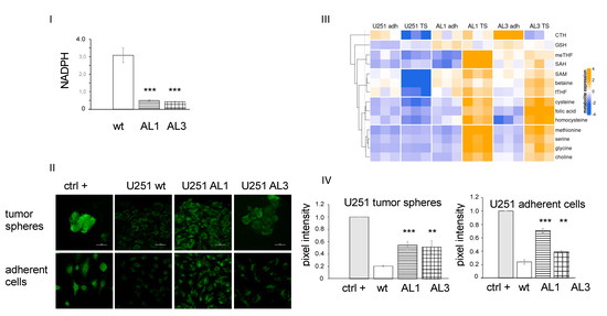 ALDH1L2 knockout U251 cells have lower NADPH level (I), no difference in GSH ratio (reduced GSH/total GSH) (II), and higher one carbon metabolites, including methionine, 5, methyl-tetrahydrofolate and formyl-tetrahydrofolate (III), as well as larger ROS production (IV). Tumor spheres were collected at passage 3 and adherent cells at 80% confluency. AL1 and AL3 were compared to U251 wild type, n = 6, ** p < 0.01, *** p < 0.001, AL1 = ALDH1L2 exon1 KO, AL3 = ALDH1L2 exon 3 KO.