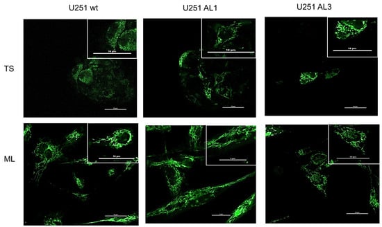 Here, to know the metabolic phenotype of the U251 cells and the effect of knocking out ALDH1L2, we compared the morphology of the mitochondria of the wild type vs. the knockout cells. As shown in Figure 4, in wild type U251 cells, the mitochondria of the TS cells is much more fragmented than those of the ML cells. This difference between mitochondria network of the TS vs. ML cells appears to diminish with the knockout of the ALDH1L2. In knockout TS cells, the organization of the mitochondria network looks more like that of the ML cells. Besides this difference, we noted that the TS of the knockout cells exhibits a much greater tendency to differentiate into ML cells when the TS was placed on poly-lysine coated cover glass (data not shown). Within less than 30 min, the TS of the knockout flattened out onto the cover slide, with a fully developed mitochondria network identical to that of the ML cells.
