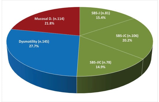 Pathophysiological mechanisms of chronic intestinal failure (n. 524). Abbreviations: SBS, short bowel syndrome; SBS-J, SBS with end jejunostomy or ileostomy (also included enterocutaneous fistulas, n. 7); SBS-JC, jejuno-colic anastomosis; SBS-JIC, jejunoileal anastomosis with an intact colon and ileocecal valve; Dysm, dysmotility (also included patients with mechanical obstruction, n. 8); Mucosal D, mucosal disease.