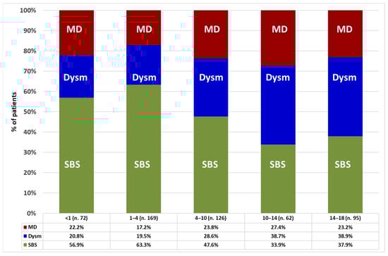 Prevalence of intestinal failure mechanisms in the patients’ age categories (years). Statistic: Pearson chi-square test for the whole group (p = 0.004); linear-by-linear association test for SBS (p < 0.001), dysmotility (p < 0.001), and mucosal disease (p = 0.282). Abbreviations: SBS, short bowel syndrome; Dysm, dysmotility; MD, mucosal disease.