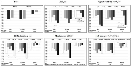 The results of the univariate analysis are shown in Figure 3 and are reported in Supplementary Table S3. WFA z-score was negatively associated with patients’ age and %IVSE/REE and was lower in patients with mucosal disease and higher in patients with the SBS-JC mechanism of CIF. LFA/HFA z-score was negatively associated with the duration of the HPN and %IVSE/REE and was lower in patients with mucosal disease and higher in patients with dysmotility or SBS-JC. BMI-FA z-score was negatively associated with patients’ age and positively with HPN duration and was higher in patients with dysmotility.