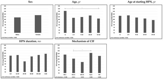 Associations of median IVS energy (%IVSE/REE) with patients’ characteristics. Spearman’s test was used for the continuous variables; Mann-Whitney’s test for the binary variable sex; The categorical variable “mechanism of CIF” was dichotomized and each dummy variable was analyzed individually; The relative effects between the categories of the ordinal variables were compared using the nonparametric multiple comparisons for relative effects test with Tukey’s test for the contrasts. * p < 0.05 between categories; direction of the comparison. Abbreviations: IVS energy (%IVSE/REE), ratio of daily intravenous supplementation total energy over estimated resting energy expenditure; HPN, home parenteral nutrition; CIF, chronic intestinal failure; SBS-J, SBS with end jejunostomy or ileostomy (also included enterocutaneous fistulas, n. 7); SBS-JC, jejuno-colic anastomosis; SBS-JIC, jejunoileal anastomosis with an intact colon and ileocecal valve; Dysm, dysmotility (also included patients with mechanical obstruction, n. 8); MD, mucosal disease.