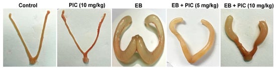 Effect of piceatannol SNEDDS on uterine morphology in rats treated with estradiol benzoate. Gross images of rat uteri collected after four weeks of treatment with estradiol benzoate (0.6 mg/kg) in the absence or presence of piceatannol SNEDDS (5 or 10 mg/kg). EB is estradiol benzoate, PIC is piceatannol, SNEDDS is self-nanoemulsifying drug delivery system.