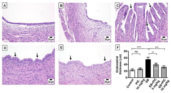 Histopathological examination (H&E staining) of uterine tissues collected from control and PIC SNEDDS alone (10 mg/kg)-treated animals revealed the normal architecture of the endometrium with a normal epithelial layer (Figure 2A,B). On the contrary, EB injection resulted in marked EH with epithelial proliferation and intraluminal papillary projections as shown in Figure 2C. Co-treatment with PIC SNEDDS (5 and 10 mg/kg) resulted in much less hyperplastic growth and projections induced by EB in a dose-related manner (Figure 2D,E). These data were further confirmed by evaluating the endometrial thickness. As depicted in Figure 2F, the endometrium in the EB group was thickened by 136% in comparison to the control group. At doses of 5 and 10 mg/kg PIC SNEDDS, endometrial thickness was significantly decreased by 29% and 42%, respectively, compared to the EB group.