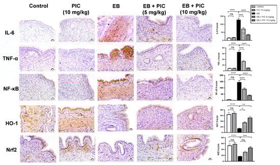 Effect of PIC SNEDDS on EB-induced alterations of IL-6, TNF-α, NFκB, HO-1 and Nrf2 expression in the uterine tissue of rats by immunohistochemical staining. Data presented in bar graphs are the mean of H-scores ± S.D (n = 6). ns = not significant, * p < 0.05, ** p < 0.01, *** p < 0.001 and **** p < 0.0001.