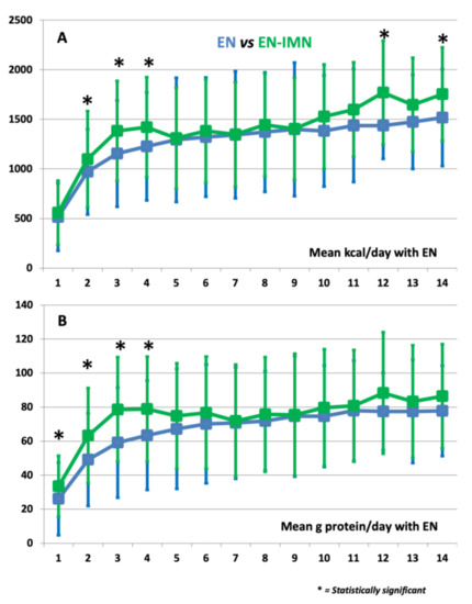 Multivariate analysis, also adjusted for confounding factors, revealed differences among patients who received IMN in terms of organ support: they required vasopressor support and RRT less frequently during their ICU stay. We also showed a higher amount of mean protein delivery with IMN formula (Table 4).