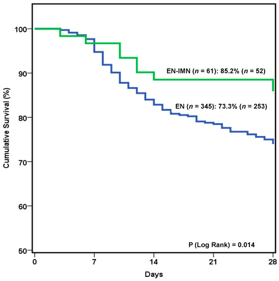 Kaplan–Meier curves and log rank test showing 28-day survival according to patients receiving immunonutrition or other types of enteral formulas.