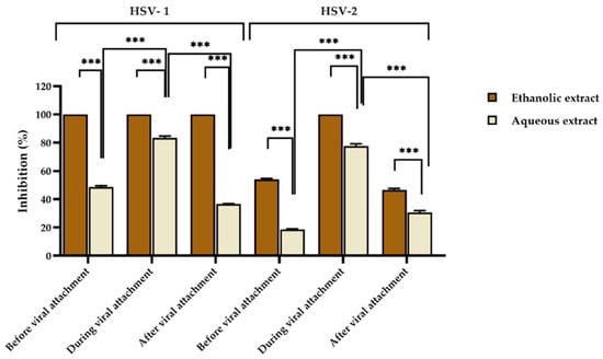 Inhibitory effect of aqueous red jasmine rice extract at 1250 µg/mL and ethanolic extract at 625 µg/mL on HSV-1 and HSV-2 before, during, and after viral attachment. (*** indicated, p < 0.0001).