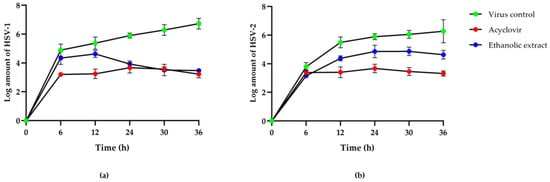 Log titers of HSV-1 (a) and HSV-2 (b) at 0, 6, 12, 24, 30, and 36 h after treatment with ethanolic extract of red jasmine rice at 625 µg/mL, compared with antiviral agent, acyclovir and virus control.