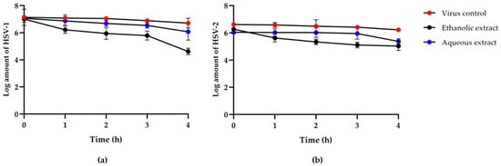 Log titers of HSV-1 (a) and HSV-2 (b) titer at 0, 1, 2, 3, and 4 h after treatment with the extracts from ethanolic and aqueous extracts of red jasmine rice, compared to viral control.