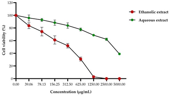 Effect of the ethanolic and aqueous extracts of red jasmine rice on Caco-2 cell viability. The cells were treated with various concentrations of 39.06 to 5000 µg/mL for 48 h and toxicities of the cells after treatment were investigated by MTT assay.
