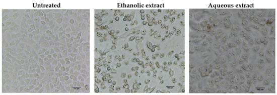 The effect of red jasmine rice extracts on Caco-2 cell viability were investigated after treatment with several concentrations of ethanolic or aqueous extracts by MTT assay. The cell viability of Caco-2 cells was decreased in a dose-dependent manner. At 48 h after treatment, the 50% inhibitory concentrations (IC50) of ethanolic and aqueous extracts were 372.56 ± 15.54 and 3177.60 ± 92.36 µg/mL, respectively (Figure 4). This finding demonstrated that the ethanolic extract of red jasmine rice revealed a greater toxicity to inhibit the growth of Caco-2 cells than red jasmine rice aqueous extract.
