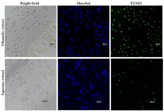 DNA fragmentation in treated Caco-2 cells after 48 h of treatment with 250 µg/mL of red jasmine rice ethanolic extract and 3000 µg/mL of red jasmine rice aqueous extract after investigation by TUNEL assay and fluorescent microscope.