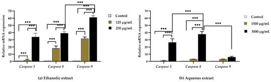 The qRT-PCR analysis of apoptosis-related gene after 3 h of treatment of Caco-2 cell with red jasmine rice ethanolic extract (a) and aqueous extract (b), compared with untreated cell control. Data are expressed as mean ± SD (n = 3 independent assays). (*** indicated, p < 0.0001).