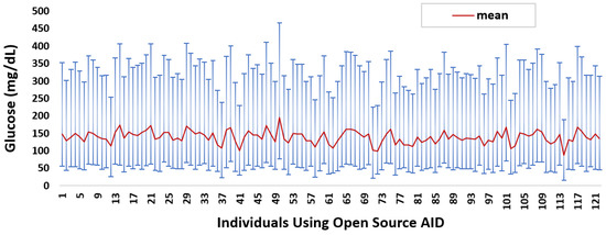 Glucose mean and distribution for insulin-requiring individuals using open-source AID systems. Total number of individuals (n) = 122. Average glucose mean and SD across the individuals is 139 ± 49.8.