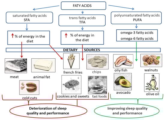 Animal fats contain, almost exclusively, saturated fatty acids. Foods that are fried in hydrogenated oil are also a rich source of saturated fatty acids [59]. Studies on the effect of saturated fatty acids on sleep have shown that the consumption of saturated fatty acids leads to a greater number of wakes at night and shortens the duration of slow-wave sleep, which is the stage of sleep during which the body can recover [59]. The regular consumption of saturated fatty acids contributes to the development of diabetes, which is often associated with sleep problems [61].