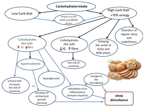 Dietary carbohydrates, and the degree of their processing, significantly affect the quality of sleep. Both low-carbohydrate and high-carbohydrate diets affect the sleep architecture [35]. Carbohydrates have been shown to affect mainly the NREM phase (slow-wave sleep) and the REM phase. Moreover, dietary carbohydrates may also delay the onset of the REM phase and may delay the onset of sleep [34,68].