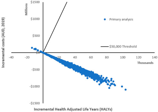 | Total Healthcare Cost-Savings | AUD 542.5 M (121.6 M; 1.1 B) | AUD 406.5 M (81.5 M; 787.4 M) |