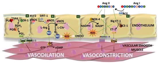 On the other hand, the endothelium also synthesizes and releases vasoconstrictor compounds, such as ET-1 which is also involved in vascular and myocardial hypertrophy and promotes inflammation as it stimulates the release of interleukins (IL-6, IL-1 and IL-8) []. ET-1 is produced in different steps, comprising the hydrolysis of prepro-ET-1 into big ET-1 by proteases and the further hydrolysis in Trp-21 of big ET-1 in its active form ET-1, catalyzed by the endothelin-converting enzyme 1 (ECE-1) []. This process is tightly regulated by different factors. In this regard, ET-1 synthesis or release is favored by Ang II, ADH, ROS, cytokines (tumor necrosis factor-alpha and IL-1), norepinephrine, thrombin or shear stress, while it is reduced by NO, atrial natriuretic peptide, cyclic nucleotides and KLF2 [,,]. The vasoconstrictor effects of ET-1 are mediated by its interaction with ETA and ETB receptors (mainly ETA receptors), located in the vascular smooth cells []. However, ET-1 can also bind to ETB receptors in the endothelial cells, presenting an opposite effect to that showed by ETA activation. Specifically, ET-1 via ETB favors the release of endothelial prostacyclin and NO, ET-1 clearance, and inhibits ECE-1 expression []. In addition, it has been observed that ET-1 can stimulate the vascular Nox expression []. Another vasoconstrictor produced by the endothelium is Ang II, as ACE is expressed in endothelial cells. This local Ang II helps to maintain normal BP, although it is not essential [,]