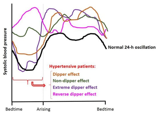 It is well known that BP in mammals follows a 24-h rhythm. Like heart rate, BP in humans reaches its highest value after awakening [,], where higher prevalence of myocardial infarction, sudden cardiac death and myocardial ischemia is observed. Moreover, it also shows a second peak in the afternoon (~7:00 p.m.). Conversely, during sleep, there is a drop (~10–20% compared with daytime values) in BP, known as the dipper effect [,,]. This effect is used to classify subjects as “extreme-dippers” (SBP is reduced ≥ 20% when compared with the daytime BP value); “dippers” (SBP is reduced between 10–20% when compared with their daytime BP); “non-dippers” (SBP does not show a drop, or it is less than 10%) and “inverse-dippers or risers” (SBP increases on nighttime BP value, instead of showing a drop) []. Figure 4 shows a representation of all these BP circadian patterns. Dippers are associated with cardiovascular health, while “non-dippers” present a higher cardiovascular risk and correlate with higher end organ damage in different tissues []. Thus, these circadian BP fluctuations are used as predictors for CVD []. Moreover, it has been seen that hypertensive patients can follow different cycle patterns, which are classified as dipper, non-dipper, extreme dipper and reverse dipper depending on BP behavior during the night [].