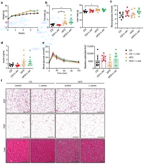 To test the effects of L-serine supplementation on body weight development and metabolic function, 4-week-old mice were supplemented with 1% L-serine in their drinking water for 8 weeks and fed either a CD or a HFD. L-serine supplementation did not alter body weight (Figure 1a) or body composition (Figure 1b). Similarly, we did not observe changes in body weight when 8-week-old mice, fed either a CD or HFD were supplemented with L-serine for 16 weeks (Figure S1a). L-serine supplementation also did not alter parameters of glucose homeostasis, such as randomly-fed blood glucose (Figure 1c) and insulin levels (Figure 1d) or glucose tolerance (Figure 1e). H&E stainings of the liver, subcutaneous (SCF) and perigonadal (PGF) fat as well as qPCR analysis in adipose depots did not indicate changes in inflammation (Figure 1f and Figure S1b) or adipocyte cell size (Figure S1c) between the control and L-serine-supplemented mice of each diet group. However, HFD feeding increased the proportion of large adipocytes compared to CD-fed mice, irrespective of L-serine supplementation. L-serine supplementation did not affect hepatic triglyceride (Figure S1d) or serine levels (Figure S1e). However, we observed a significant decrease in the liver weight of serine-supplemented mice upon HFD feeding but not CD feeding (Figure S1f), as well as a trend towards reduced glycogen levels in both CD-fed and HFD-fed mice (Figure S1g). The expression of Phosphoenolpyruvate carboxykinase (Pepck) was increased in the CD-fed mice supplemented with L-serine, which was not observed upon HFD feeding (Figure S1h). We did not observe any differences in pyruvate tolerance between the serine-supplemented and control animals on either diet after 1 week of supplementation (Figure S1i).